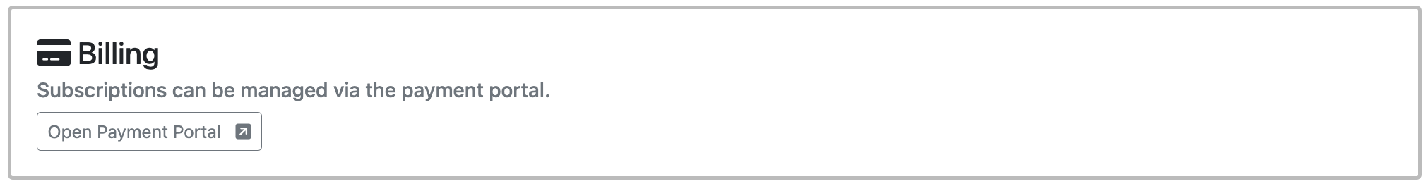 When using the credit card payment method Stripe billing portal is available via the Open Payment Portal button. When clicked this will open a self serve portal on the Stripe website where the billing information can be updated and the payment method changed or canceled.