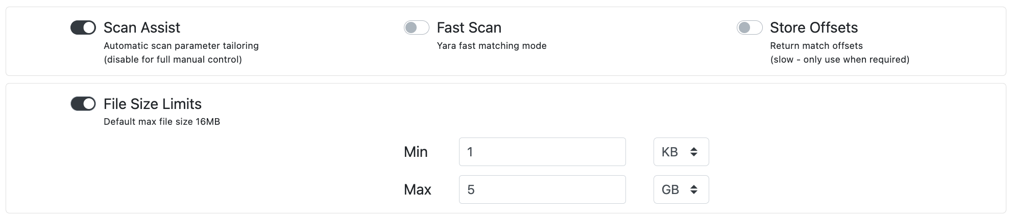 File size limits can be specified outside of the YARA rule. When enabled these will pre-filter samples based in size prior to staging them for scanning but they will not override any file size settings in the rule itself.