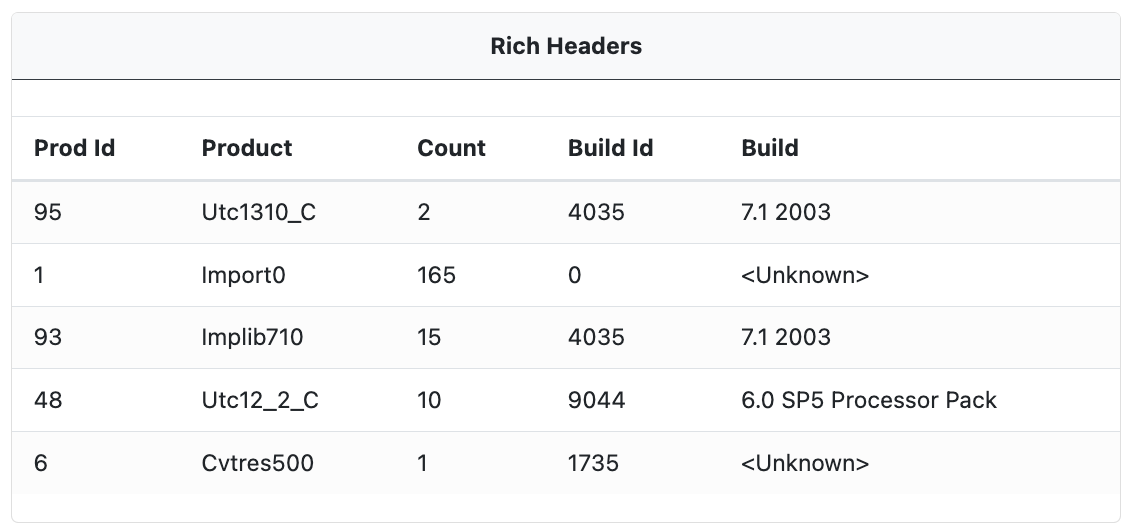 When available, embedded Rich Headers are extracted from the sample. These contain information about the compiler and build process (linker version, import library, resources, etc). The Rich Headers can list multiple compiler versions as a single executable can be built from multiple object files, and those object files can be compiled with different versions of a compiler.