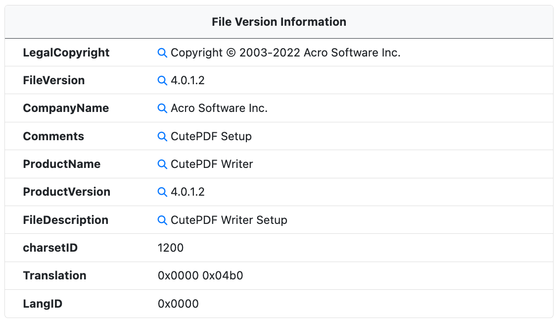 When available, the File Version Information metadata is extracted from the PE resources. This metadata is used to identify the software, version, and developer.