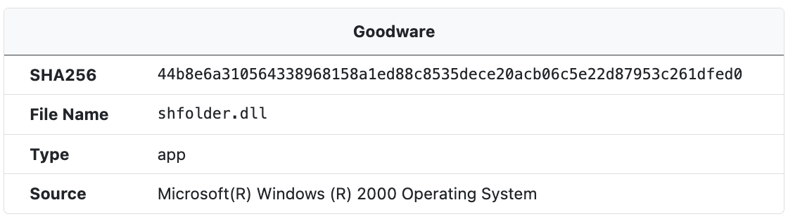 When a sample SHA256 hash matches with a hash in the UnpacMe Goodware repository a Goodware label and information about the file's origin is presented in the Goodware window.