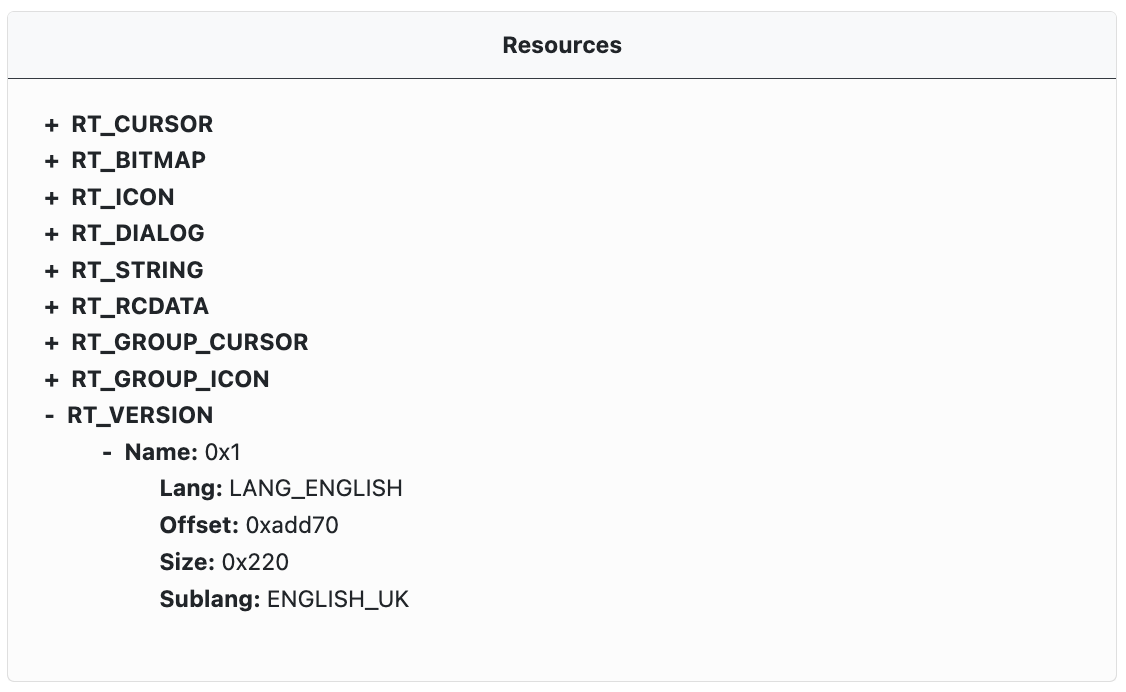 When available, information from the PE Resources table is extracted and displayed as an expandable tree. Each resource entry has a type, size, and an offset in the PE file.