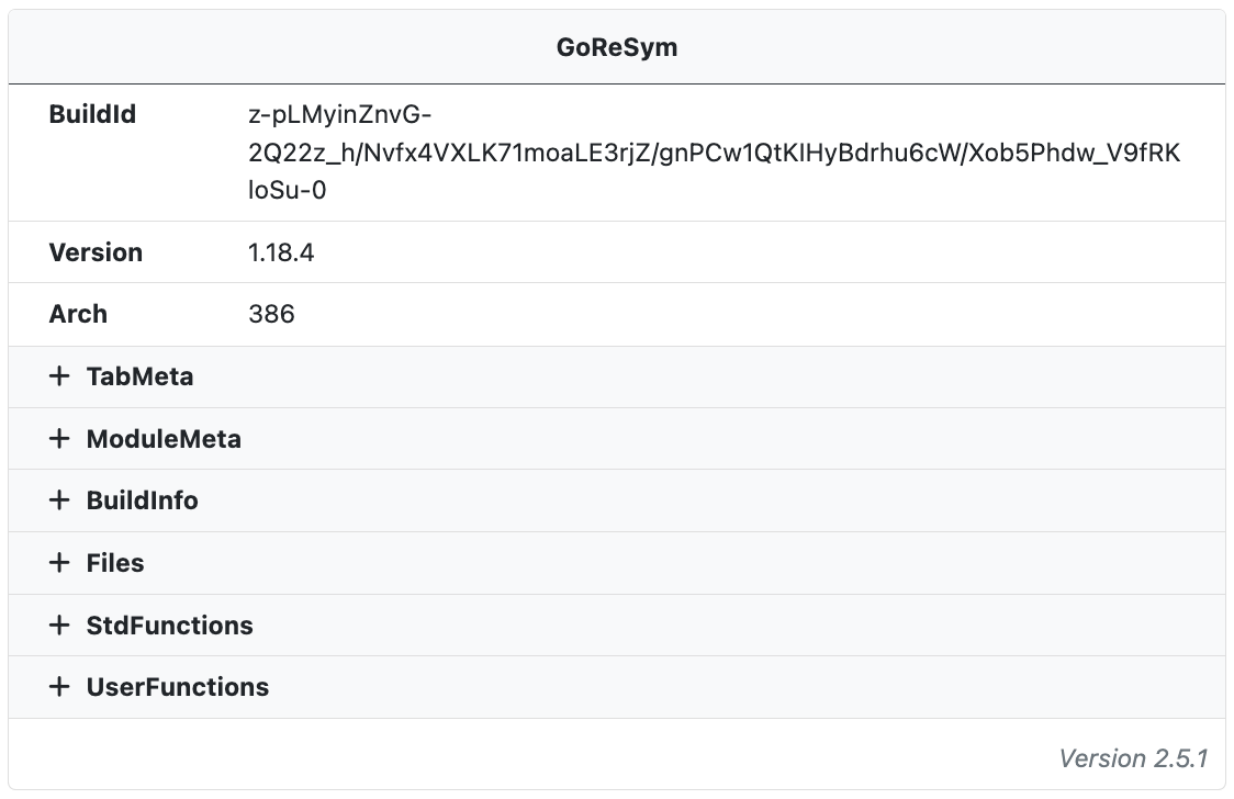 The open source tool GoReSym is run on all Go binaries and used to extract information about the Go build environment. The symbol parser extracts program metadata (such as CPU architecture, OS, endianness, compiler version, etc), function metadata (start & end addresses, names, sources), filename and line number metadata, and embedded structures and types.