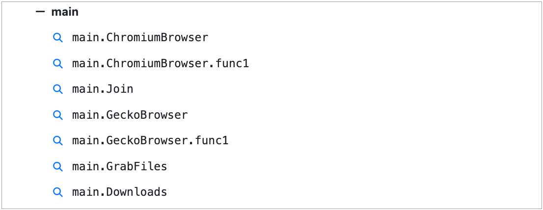 Of particular interest are the method names in the UserFunctions section, specifically the main module. Often these method names directly indicate the functionality of the binary and can be used to hunt for similar samples.