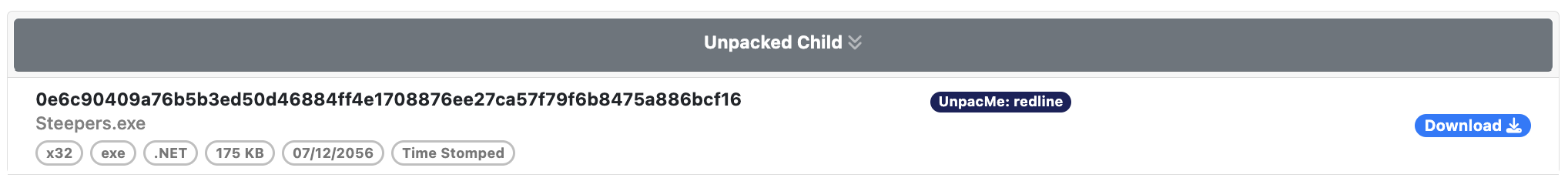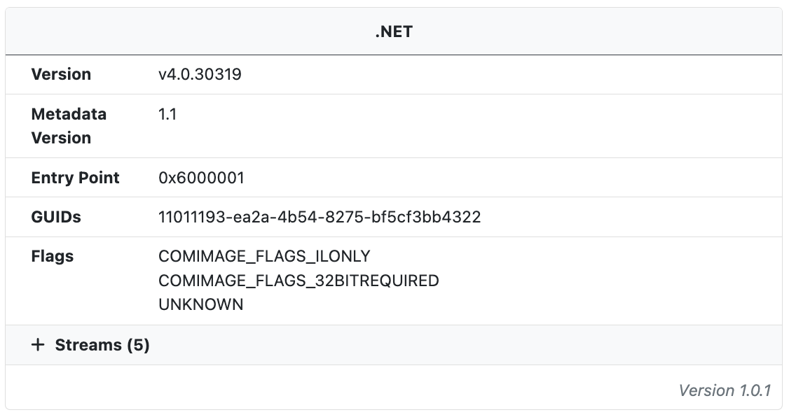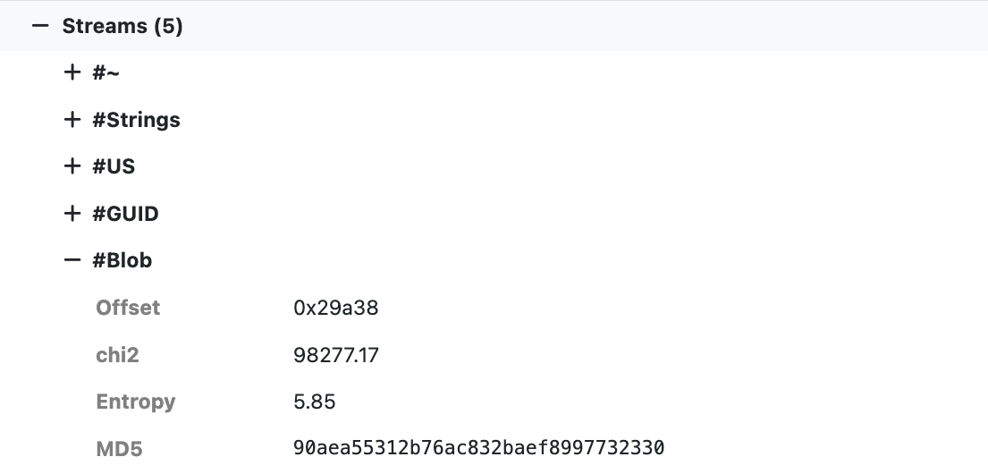 When .NET binaries are detected additional information about the .NET runtime and assembly is extracted. In addition to build metadata the streams are also extracted and labeled with their name, offset, chi2 value, entropy, and MD5 hash.