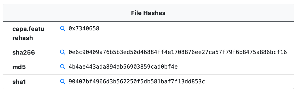 The File Hashes module provides hashes that can be used to identify the sample. In addition to an MD5, SH1, and SHA256 hash of the sample itself the following hashes may also be included.