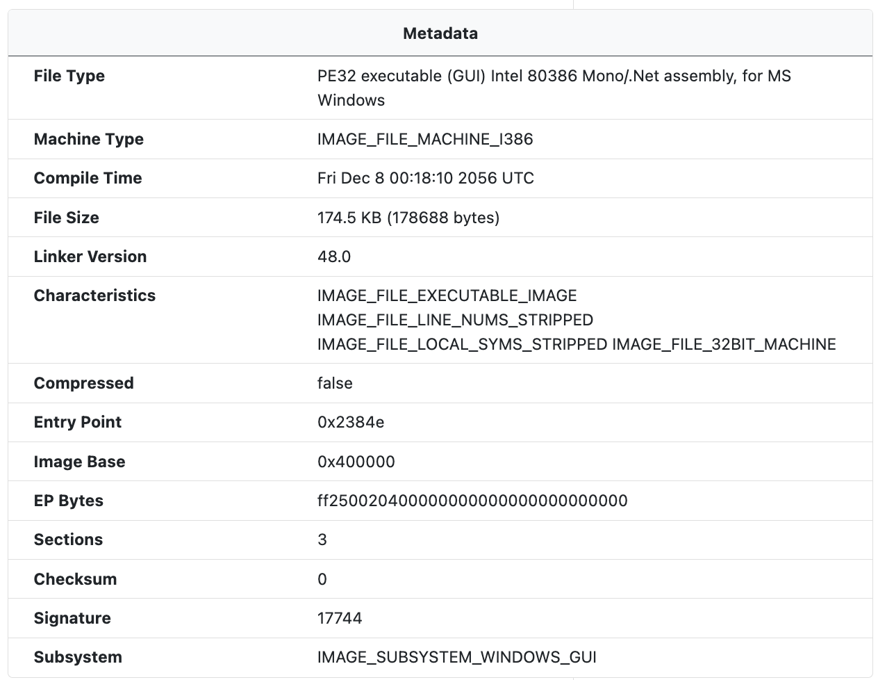 The Metadata module extracts PE metadata from the sample including the PE type, the machine type, and characteristics, among other information.