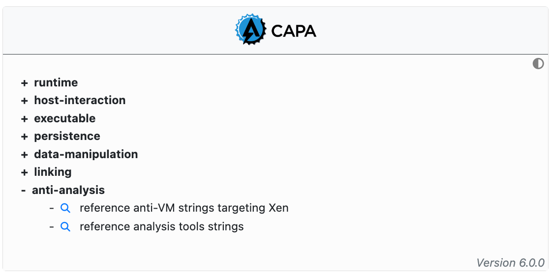 The open source tool CAPA is run on all samples. CAPA is a signatures based tool that statically extracts capabilities. For example, detection of anti-VM strings in a binary might indicate that the binary has VM evasion capabilities. The extracted capabilities are categorized and displayed in an expandable tree. All capable are searchable enabling analysts to hunt for samples with shared capabilities.