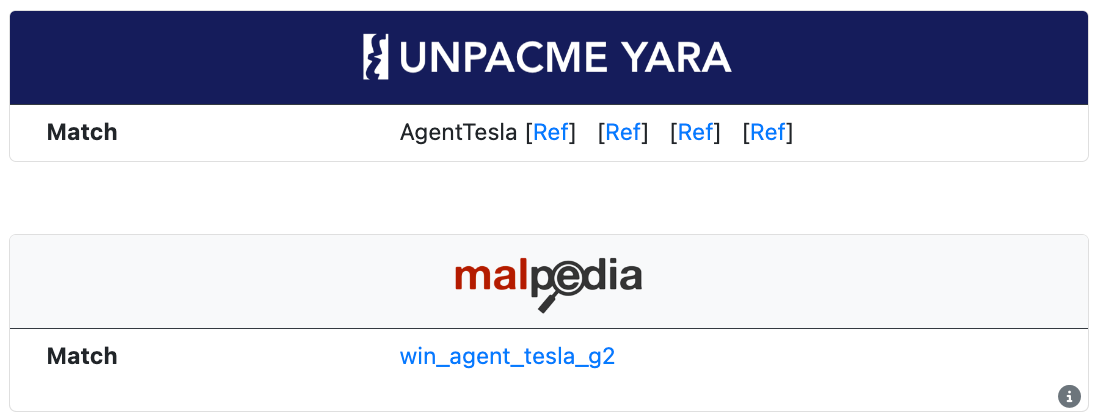 UnpacMe rules include links to OSINT information related to the sample identified by the rule, while Malpedia rules include a link to the Malpedia entry for the rule.