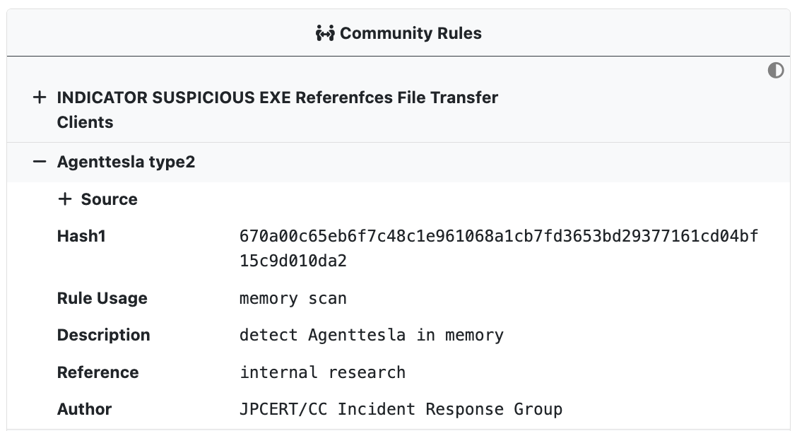UnpacMe maintains a curated collection of open source community Yara rules which are run against all samples. Rule hits are displayed in the Community Rules window and are searchable.