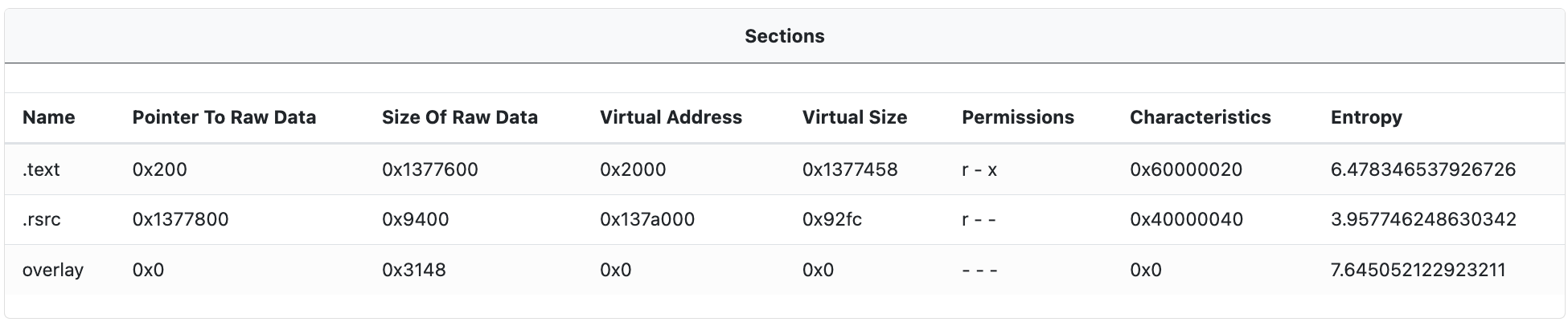 Name: This is the name of the section. Common names include.text,.data, and.rsrc.Pointer To Raw Data: This is the offset in the file where the section's data begins.Size Of Raw Data: This is the size of the section's data in the file.Virtual Address: This is the address where the section will be loaded into memory when the PE file is executed.Virtual Size: This is the size of the section when it is loaded into memory.Permissions: This indicates the access permissions for the section, such as whether it can be read, written, or executed.Characteristics: This provides additional information about the section, such as whether it contains code or data, and whether it is initialized.Entropy: This is a measure of the randomness of the data in the section. It can be used as an indicator of whether the section contains compressed or encrypted data. High entropy suggests the data is compressed or encrypted, while low entropy suggests it is not.