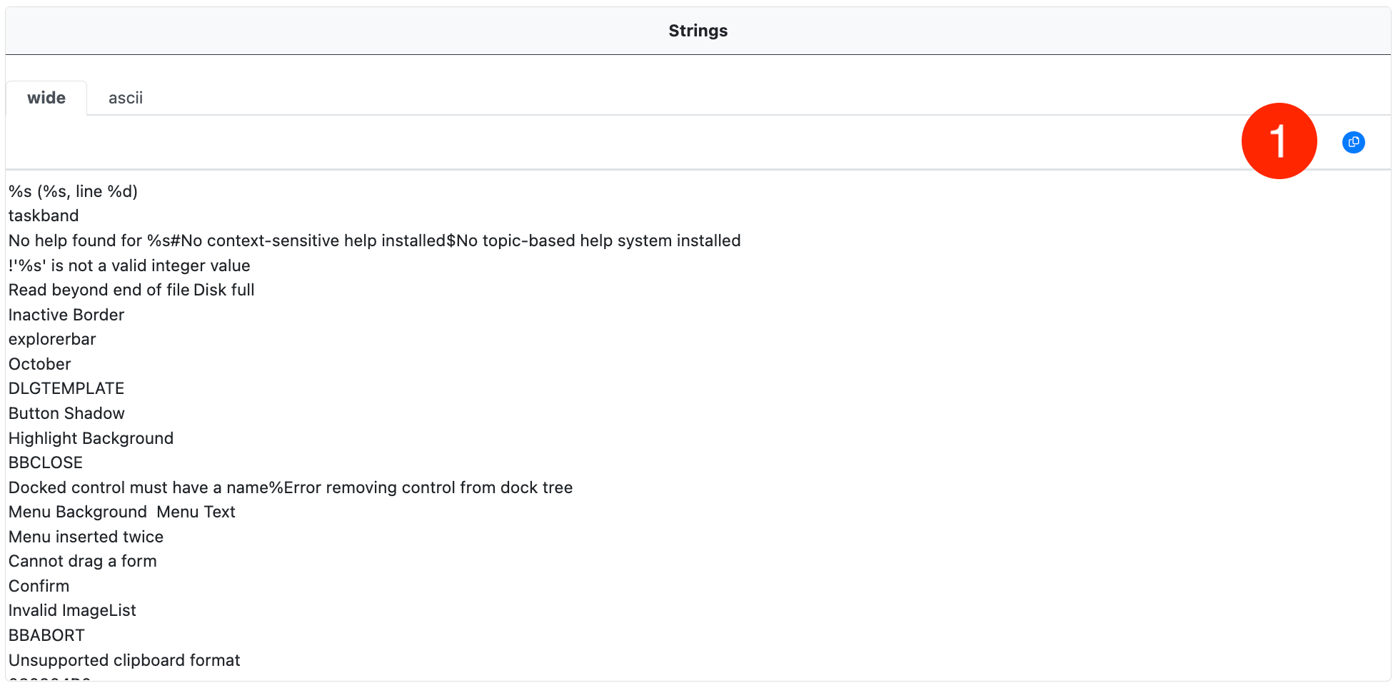 The full strings list in the current tab can be copied to the clipboard using the copy-to-clipboard button (1).