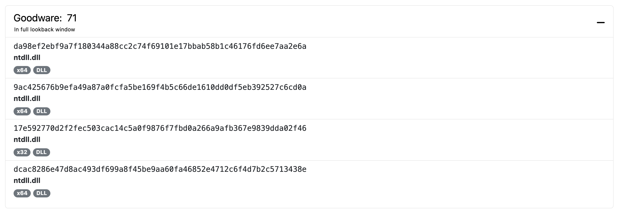 The goodware window can be expanded to reveal a scrollable list of all matches. Each match includes details about the file including the file's SHA256 hash, the name of the file, and the file type.