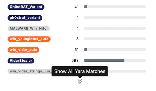 The default YARA distribution graph will display seven labels. If there are more than seven labels a drop down arrow will appear which can be clicked to view all labels.