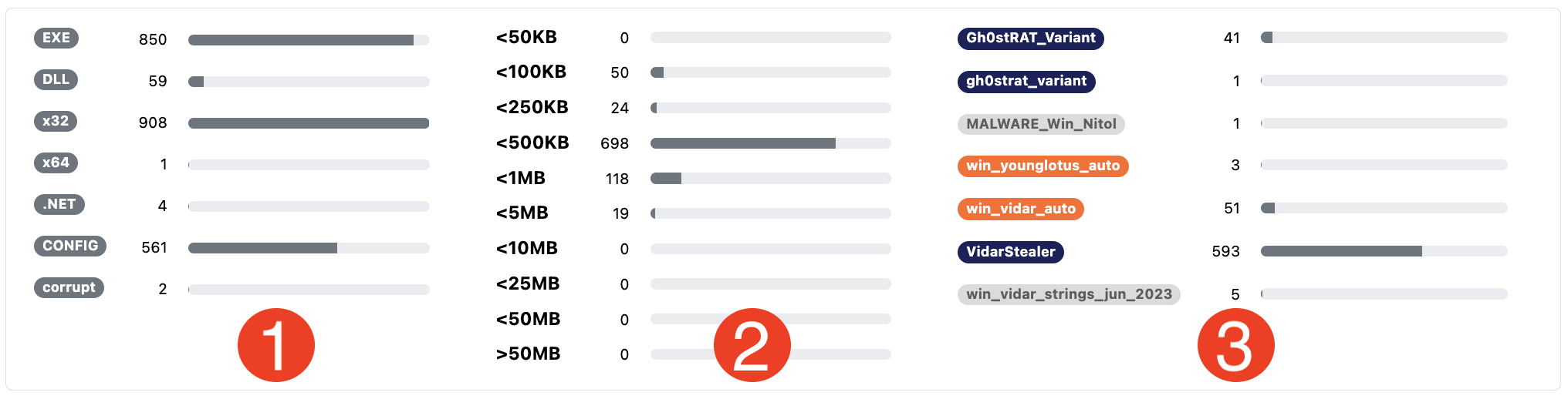 The file size distribution graph categorizes the file size of the search matches. File size is a powerful indicator of similarity and the size distribution graph can provide quick insight into the similarity of the results.