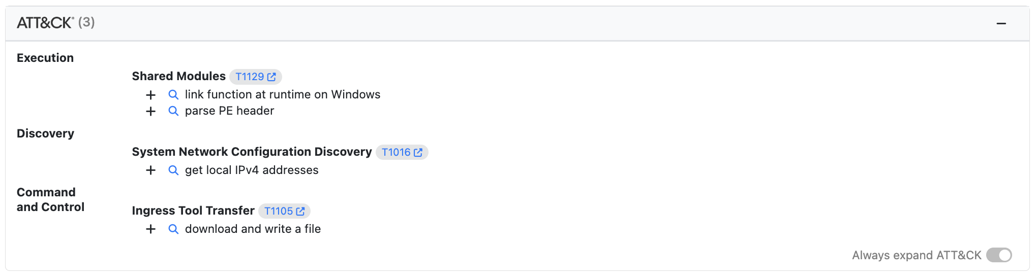 The ATT&CK map for an analysis is displayed at the top of the Results page. This map displays the full capabilities of the Parent and all of the Children. Each technique has a link to the technique description on the MITRE website and an expandable tree which lists the samples in the analysis that implement the technique.