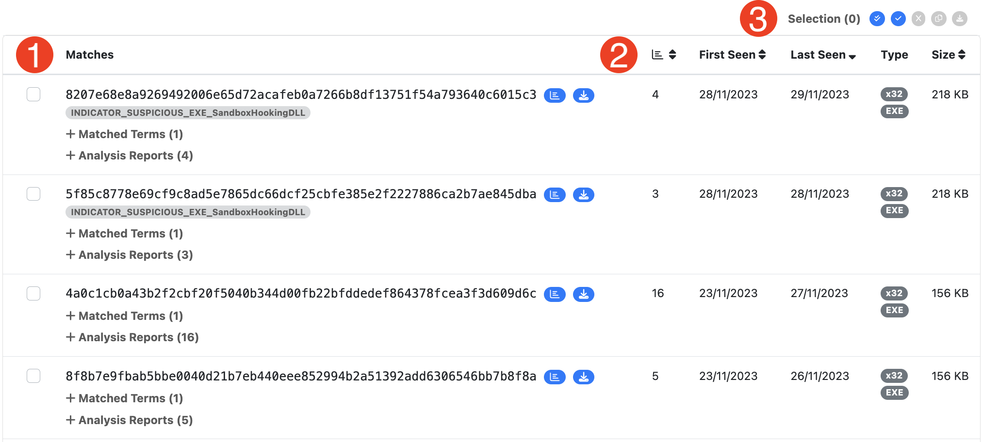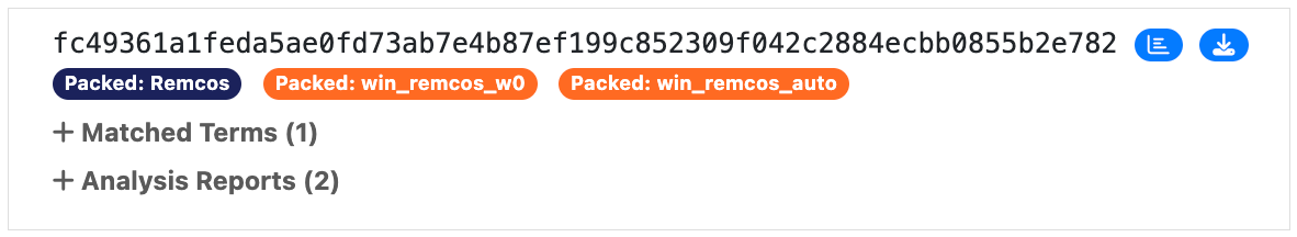 - Analysis Report Count - the number of analysts reports that contain the match. This is a useful metric for identifying samples that have been packed in multiple different parent files.