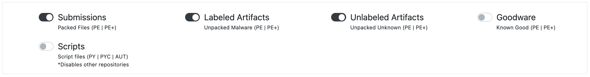 When launching a YARA Lightning Hunt up to four different sample repositories can be selected to scan; Submissions, Labeled Artifacts, Unlabeled Artifacts, Scripts, and Goodware.