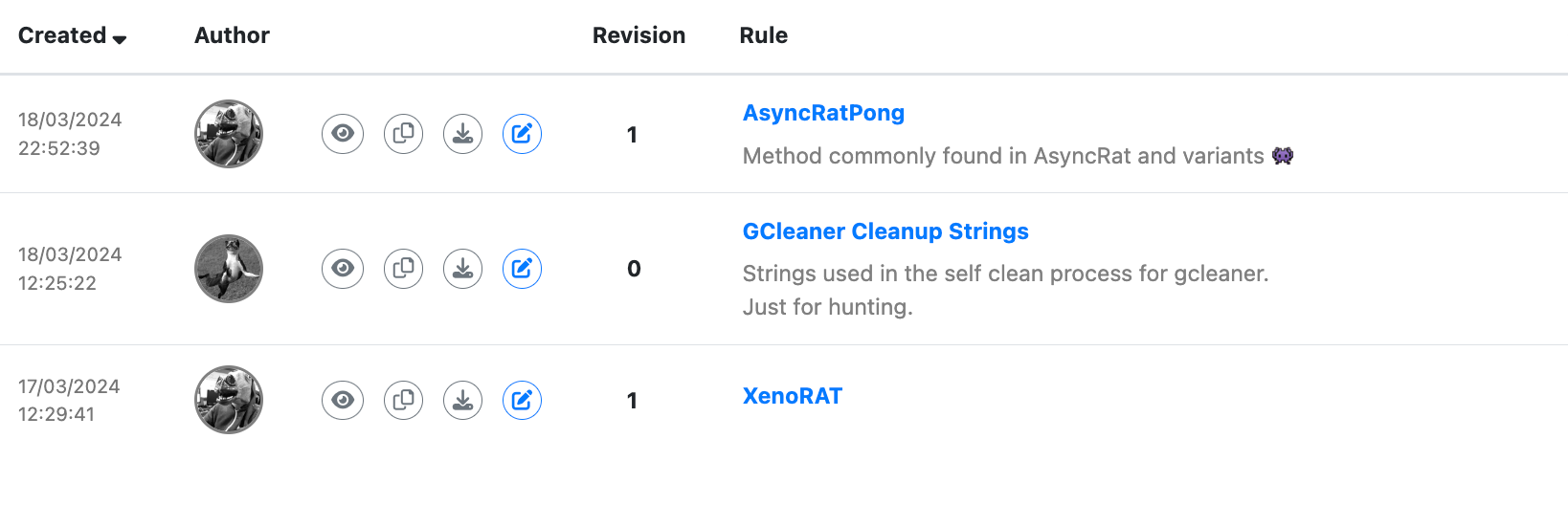 YARA rules that are shared with the community appear on the Community YARA Rules page. These rules can be viewed, downloaded, and copied by other UnpacMe users. Sharing rules is a great way to collaborate with other users and build open source intelligence.
